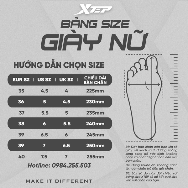 BẢNG SIZE GIÀY NỮ XTEP:
